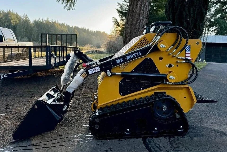 2024 AGT MX-MRT14 MINI SKID TRACK LOADER POWERED BY 13.5HP GAS ENGINE. 800LB LIFT CAPACITY, 1900LB MACHINE, 6′ LIFTING HEIGHT. 32″ BUCKET WITH UNIVERSAL QUICK ATTACH (DINGO STYLE), JOYSTICK CONTROLS, AUX HYDRAULICS, LED LIGHTS, RIDING PLATFORM, USB CHARGER, 8″ TRACKS.