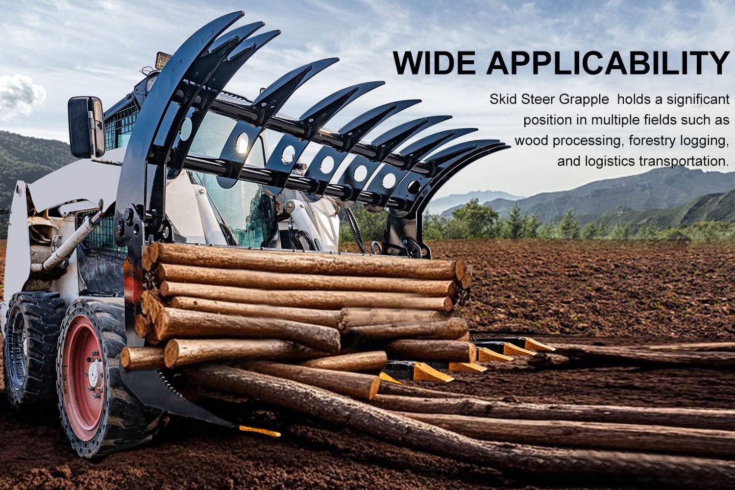 Universal Mount: MMS skid steer grapple attachment can hook up to universal skid steer loader.