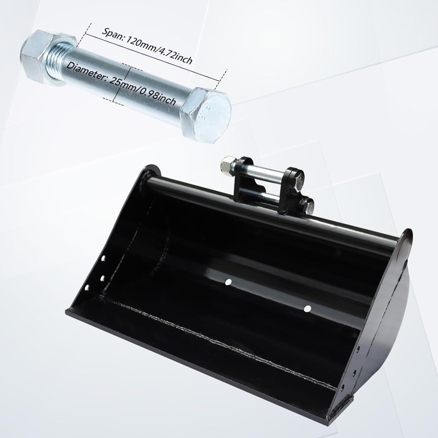 This bucket can be easily mounted to an excavator to get the job done efficiently. It is compatible with most mini excavators on the market. The hole diameter is 25 mm/0.98 inches. The center wheelbase is 88 mm/3.46 inches. Span length is 90 mm/3.54 inches.